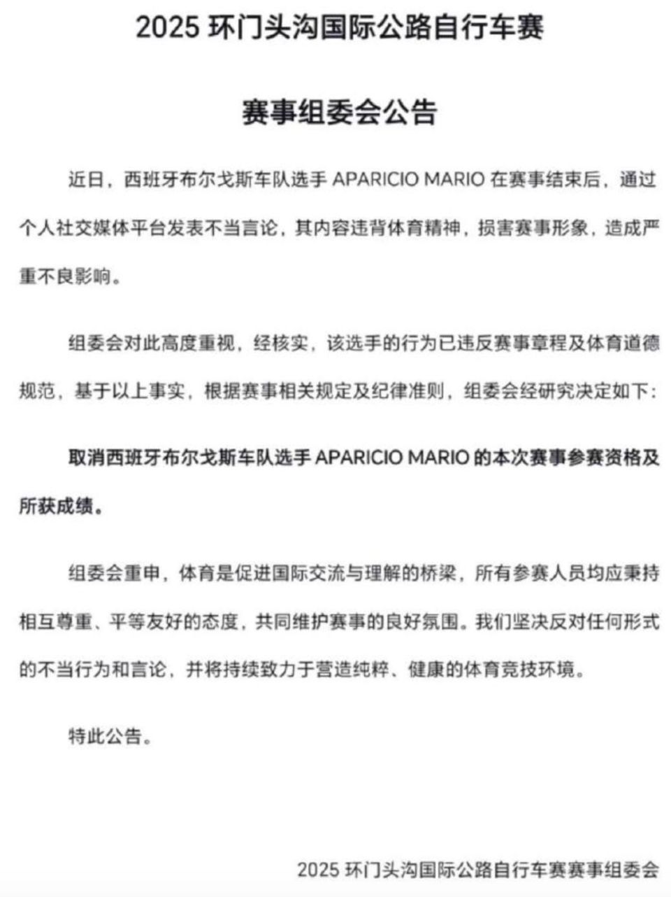 10月13日,赛事主办方发布公告,确认阿帕里西奥的行为构成了不当言论,强调其违反了体育精神、损害了赛事的形象并造成了非常恶劣的影响。依据赛事规定,组委会决定取消阿帕里西奥其本次赛事的所有成绩。